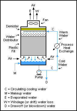 在相鄰的圖表中,從塔盆泵出的水是流經工業設施中的工藝冷卻器和冷凝器的冷卻水。冷卻水從需要冷卻或冷凝的熱工藝流程中吸收熱量,吸收的熱量使循環水升溫(C)。熱水回流到冷卻塔頂部,向下流過塔內的填料。當它向下流動時,它通過自然通風或在塔中使用大型風扇的強制通風,與塔中上升的周圍空氣接觸。這種接觸會導致少量的水隨著風(W)和一些水(E)的蒸發而流失。蒸發水所需要的熱量來自于水本身,它將水冷卻回原來的盆地水溫,然后水就可以再循環了。蒸發后的水將其溶解的鹽留在未蒸發的大部分水中,從而提高了循環冷卻水中的鹽濃度。為了防止水的鹽濃度過高,一部分水被抽走/吹下來(D)處理。向塔盆提供淡水補給(M),以補償蒸發水、風損水和抽放水的損失。